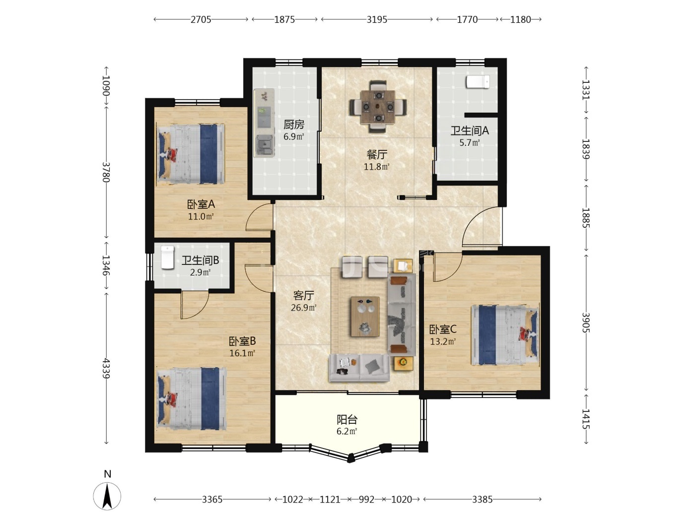 户型:3室2厅1厨1卫1阳台